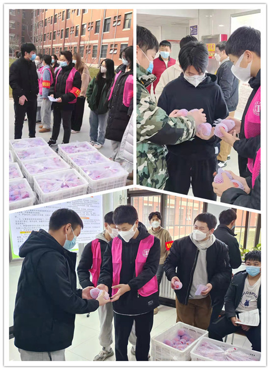 在富平校区学生公寓楼下,捐赠企业的工作人员与二级学院党员志愿者一起有序分工,将“苹”安“果”香,爱心传递到每一位渭师学子手中,祝愿渭南师范学院校园平安,学子健康。
