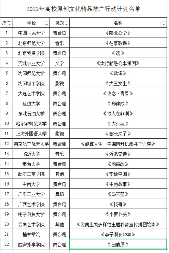 2月23日,金博宝最新官方网站查询网址 官网发布《金博宝最新官方网站查询网址 思想政治工作司关于公布2022年高校思想政治工作有关培育建设项目入选名单的通知》,西安外事学院舞台剧《白鹿原》成功入选2022年“高校原创文化精品推广行动计划”。一同入选的还有中国人民大学舞台剧《陕北公学》、北京师范大学音乐《往事歌谣》等共计22个精品。