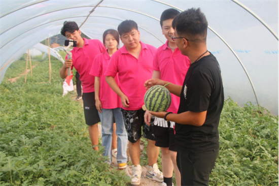 ——走访基地探发展,科技助农促振兴。实践团前往种植芹菜和麒麟西瓜大棚基地中进行调研,并通过直播带货大力宣传推销当地特色农产品。直播开始后,“主播们”声情并茂地讲解有机芹菜、麒麟西瓜、泾阳茯茶、陇县蜂蜜以及黑木耳等当地特色农产品,赢得网友的点赞。