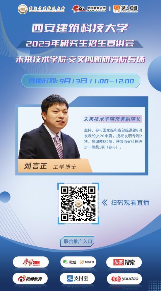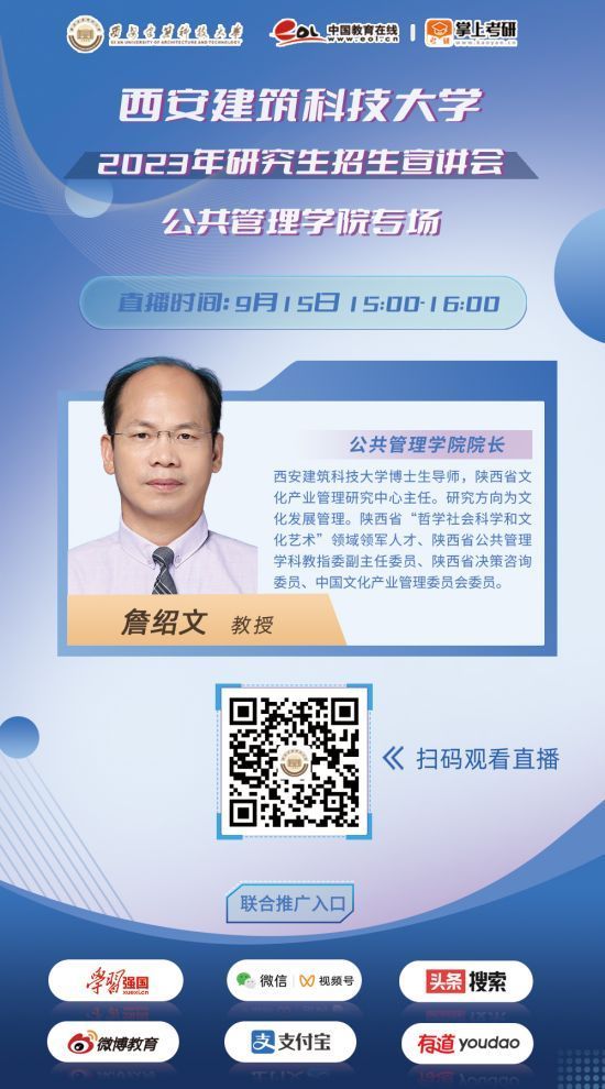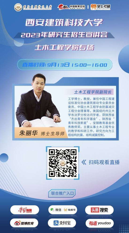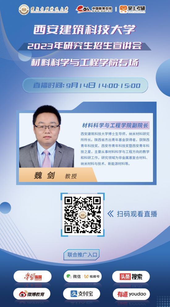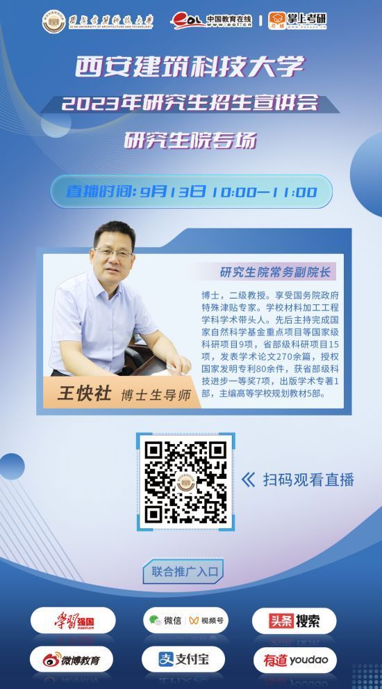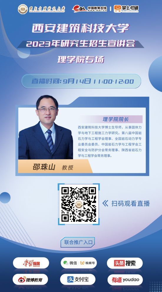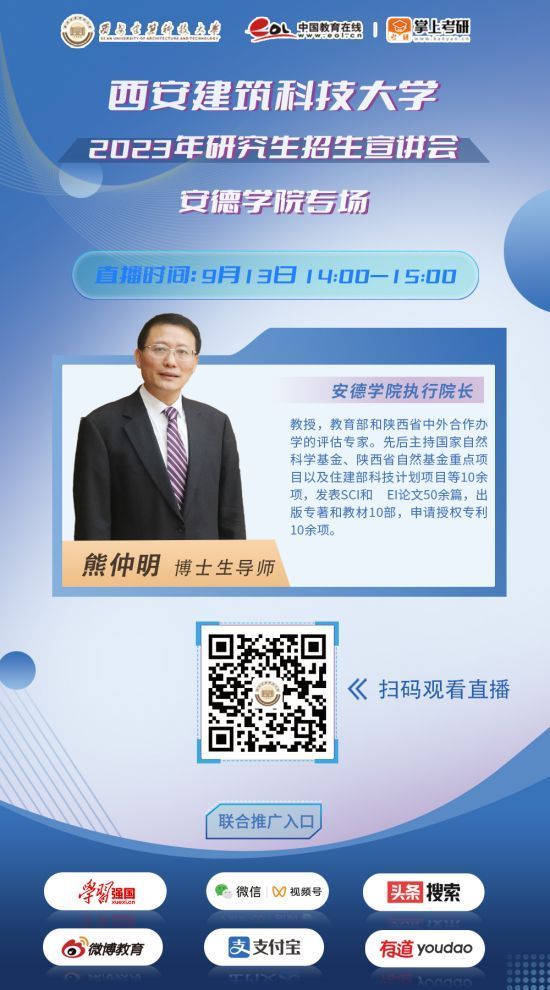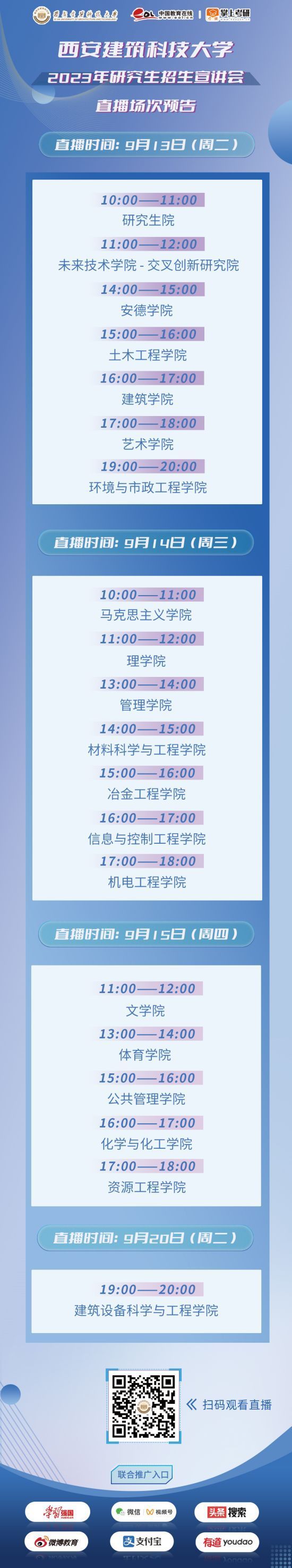 为畅通研究生招生咨询渠道,帮助同学们详细了解研究生招生考试新政策和新变化,助力广大考生更加充分地备考,9月13日-9月20日,西安建筑科技大学2023年研究生招生线上宣讲会,20位专家教授与你相约!