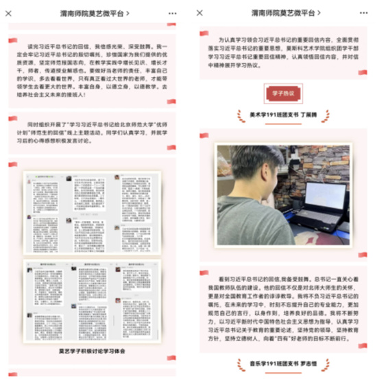 同学们表示在宿舍与学校和学院领导一起学习,感到十分温暖,学习习近平总书记回信,深有感触,倍受鼓舞,她们结合在学校的学习收获以及暑期支教、兼职等社会实践经历,表示会在专业上不断提升自己,增长才干,为美育教育奉献一份热,散发一份光。