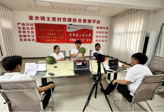 ——走进产业基地,感受智慧农业。实践团来到圣水镇王营村食用菌产业基地,聆听经营者从食用菌种植、成品、烘干到销售等全过程讲解,近距离感受现代化农业产业的发展。前往种植蔬菜西瓜大棚基地中进行调研,并通过直播带货大力宣传推销当地特色农产品。直播开始后,“主播们”声情并茂地讲解有机蔬菜、西瓜、汉中茶叶、食用菌等当地特色农产品,赢得网友的点赞。