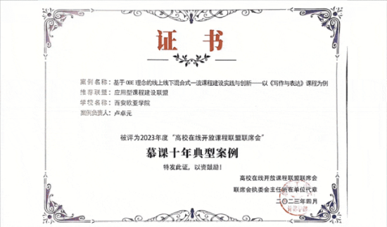 教规建中心应用型课程联盟举办的课程建设系列大赛中累计获奖17项,其中一等奖2项;学校自建48门在线开放课程在智慧树平台实现跨校共享,累计选课学校3150所,累计选课人数超74万人次;10门课程思政设计在新华网“新华思政”平台共享;100门校级重点课程中100%课程引入真实项目,沉淀案例2024个,在OA知识平台共享。
