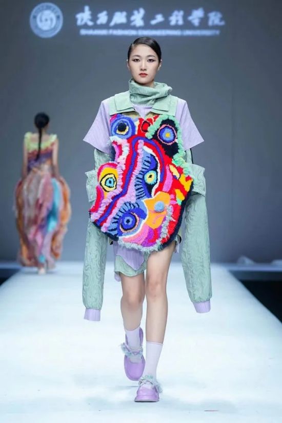 长安,即今天的西安,是古丝路起点,它连接了中西方不同的思想。陕西服装工程学院隶属于十三朝古都西安,坐落在丝路源起,这座古老的城市给予我们珍贵的文化精粹。此篇章的毕业设计中,选取具有陕西地域代表性的皮影、兵马俑、剪纸等文化符号,运用数码印花、滴胶技法、激光切割、镂空工艺、戳戳乐技法等,辅以现代服饰的轮廓造型进行创新设计。敦煌,丝路的必经一站,它不仅是丝路上的重要节点,同时也是东西方文化交流的里程碑,其中孕育着丰富的壁画内容和生动的传统故事。这个篇章中的毕业设计作品来源于敦煌壁画中丰富的图案题材。例如将藻井纹样、忍冬纹样、缠枝纹样等传统图案元素,结合当下服装机能风格、休闲风格、运动风格等风格服装款式,进行解构设计,在服装色彩中将无色系和有色系进行碰撞,呈现出传统文化元素与现代设计元素的对比效果。在服装局部细节工艺设计中,利用抽绳、编结、抽褶等工艺手法,借助拼接绗缝工艺手法,设计出极具时尚感的现代服饰。