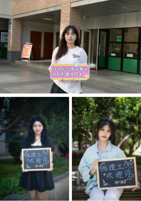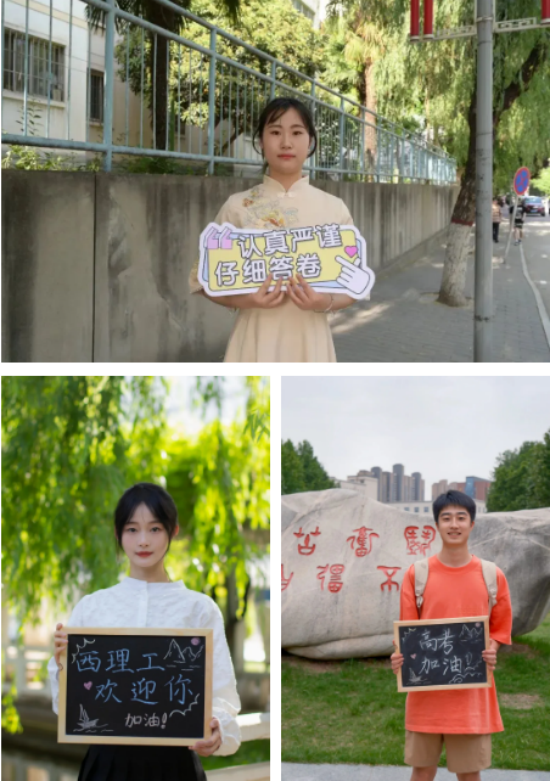 祝愿参加高考的莘莘学子:寒窗苦读,今朝瞩目;成竹在胸,轻松自如;梦想成真,纵横无阻;西理国工,祝君宏图,人生如愿,辉煌坦途!