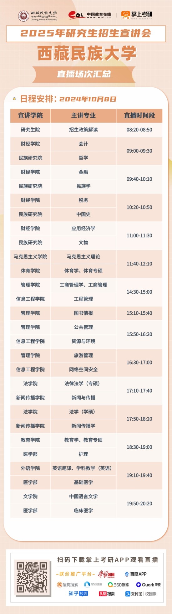 亲爱的同学们,万众瞩目的时刻正悄然逼近!西藏民族大学2025年研究生招生直播宣讲盛会,于2024年10月8日,在云端与您激情碰撞,共赴知识的盛宴!