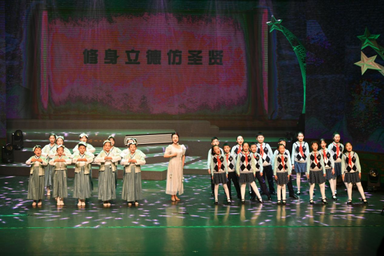整场演出采用点线式串联、篇章式结构,分为“致敬”“信念”“奋斗”“使命”4篇章展开。情景展示《在路上》作为脉络,贯穿始终,十位来自教育领域不同岗位的共产党员代表依次登场,在岁月的序章里,用质朴坚定的话语诉说铮铮誓言,以一幕幕乐章向观众们深情传递党的初心与使命。如人物讲述《照片背后的故事》,以真实的历史照片和生动讲述,将观众带入《洪湖赤卫队》中我国纪检监察工作奠基人之一钱瑛的感人故事;女子群舞《莲》采用中国画的写意手法,舞者宛如朵朵莲花在悠扬乐声中翩翩起舞,将“出污泥而不染,濯清涟而不妖”的君子品格诠释得淋漓尽致;少儿歌谣《四知歌》通过孩子们清脆的歌声,唱出东汉名臣杨震“四知却金”的经典故事,以古今对话方式传承中华优秀传统文化;小品《舌尖上的安全》别出心裁,以校园食品安全为切入点,通过幽默诙谐又极具现实意义的舞台表演,深刻揭示了校园食品安全问题的重要性,给观众上了一堂生动的警示教育课。尾声《使命》再次将观众引入鲜活情境,雄浑壮阔的歌声唱出了新时代青年对未来充满信心和勇气,点燃了全场观众的激情与共鸣。