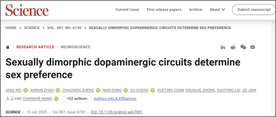 2025年1月10日,西安交通大学王昌河教授团队在《科学》杂志上发表了题为“Sexually dimorphic dopaminergic circuits determine sex preference”的研究论文。该研究首次证实,成年雄鼠和雌鼠(非发情期)在正常生理条件下均表现为雌性社交偏好,在面临生存威胁时,它们均会转变为雄性社交偏好,中脑多巴胺(DA)奖赏系统是决定这一行为决策的核心机制,但雄性个体与雌性个体采用了不同的环路决策机制(性别二态性)。雄性个体腹侧被盖区多巴胺能神经元(VTADA)向伏隔核(NAc)投射的奖赏环路(生殖繁衍的内在需求)介导了其雌性社交偏好,而DA向内侧视前区(mPOA)投射的防御环路(响应外在生存威胁)则介导了其雄性社交偏好,两个环路之间的竞争与平衡决定其最终的性别选择决策;在雌性个体中,其雌雄偏好性均由VTADA-NAc奖赏环路介导,该环路中DA神经元的放电模式(紧张性放电促进雄性偏好、时相性放电介导雌性偏好)决定了其社交性别偏好。
