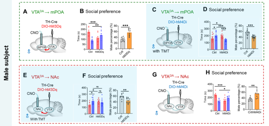 为进一步明确DA环路在雄鼠性偏好中的调控作用,作者通过化学遗传学手段分别操纵VTADA-mPOA和VTADA-NAc投射环路。研究发现,激活VTADA-mPOA防御环路促进了其雄性偏好,而化学抑制该环路则可逆转TMT环境下雄性动物对同性的偏好,表明VTADA-mPOA环路是介导雄鼠同性社交偏好的关键机制。相反,化学激活VTADA-NAc奖赏环路可将TMT场景下的雄性偏好逆转为雌性偏好,而抑制该环路则抑制了雄鼠的雌性偏好。以上结果表明,奖赏通路(VTADA-NAc)和防御环路(VTADA-mPOA)之间的竞争平衡(代表其内在生理需求与外部威胁之间的动态平衡)决定了雄性动物的社交性偏好。