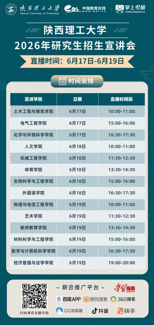 为更好服务广大考生陕西理工大学2026年研究生招生直播宣讲会,将于6月17日-6月19日精彩来袭!