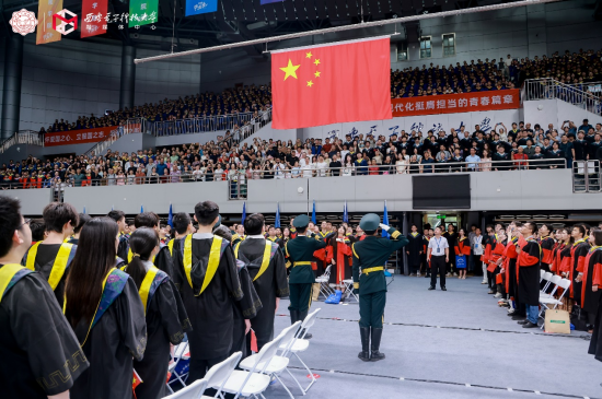 伴随着《红旗颂》宏伟庄严、气壮山河的旋律响起,一面巨幅中国共产党党旗在毕业典礼现场徐徐展开。这面凝聚着千钧力量的旗帜,由现场千余名师生共同托起,庄严传递。