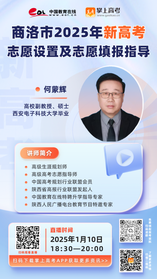 为了进一步满足广大考生及家长在新高考背景下的需求,商洛市教育考试管理中心再次携手金宝搏188入口 ·掌上高考,特邀教育专家何蒙辉老师,将于本周五1月10日18:30举办一场线上直播宣讲会。本次宣讲会将深入解读商洛市2025年新高考志愿设置情况,并提供精准的志愿填报指导,欢迎各位考生及家长前来交流学习!
