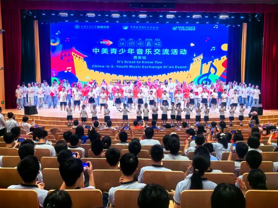 2025年7月7日,应中国教育国际交流协会邀请,美国One Voice合唱团来到古都西安,一场跨越太平洋的青春对话在丝路起点拉开帷幕。“认识你真好”中美青少年音乐交流活动在西安交通大学附属中学隆重举行。中国教育国际交流协会主任金雷、陕西教育国际交流协会会长陈乃霞,陕西省文旅厅对外合作与交流处、美国One Voice儿童合唱团及西安交通大学基础教育管理处、国际处,宣传部、团委等负责人与代表,以及附属中小幼师生等近千人齐聚一堂,以音乐为纽带开启了一场跨越山海的文化对话。此次活动由西安交大附中蔡翔宇、遆宣翊两位同学主持。