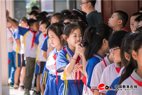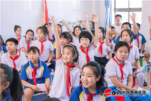 实践队员为小学生们介绍志愿者的含义以及志愿者标志。