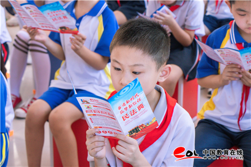 小学生正在认真阅读民法典宣传册上的法律知识。