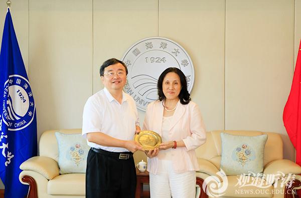 闫菊副校长(右)代表中国海洋大学向徐晓飞副校长赠送纪念品