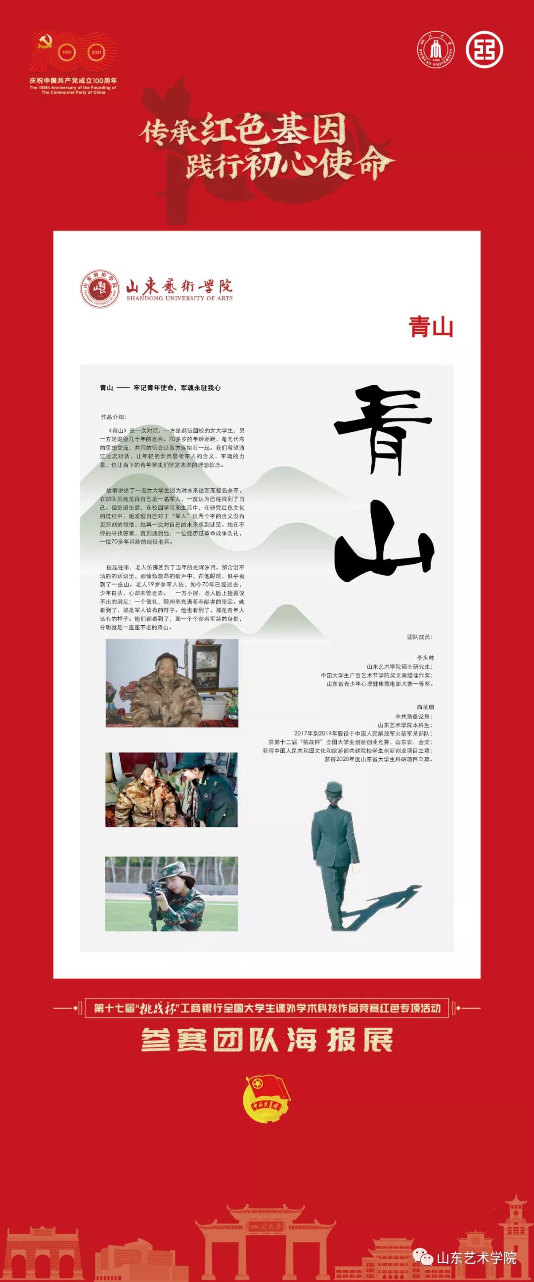 《青山》由设计学院副教授郑晓迪、袁小伟指导,设计学院2020级研究生李永帅、2016级艺术设计学专业本科生尚凌珊(当兵退伍)创作。项目自2021年1月启动以来,行4000余公里,跨7个地市,走访红色展馆、纪念馆15个,采访退伍老兵7位,其中建国前90多岁高龄老兵5位。团队通过重走红色足迹、追溯红色记忆、访谈红色人物、挖掘红色故事,以此体悟红色文化、感受党的红色精神伟力。该项目由视频和调研报告两部分组成,通过实地调研和人物访谈整理调查报告和采访口述近20万字,通过一个退伍女大学生和95岁退伍老兵的对话,展现了红色文化和革命精神在当代青年大学生中的传承,是山东艺术学院学子向党的百年华诞的献礼。