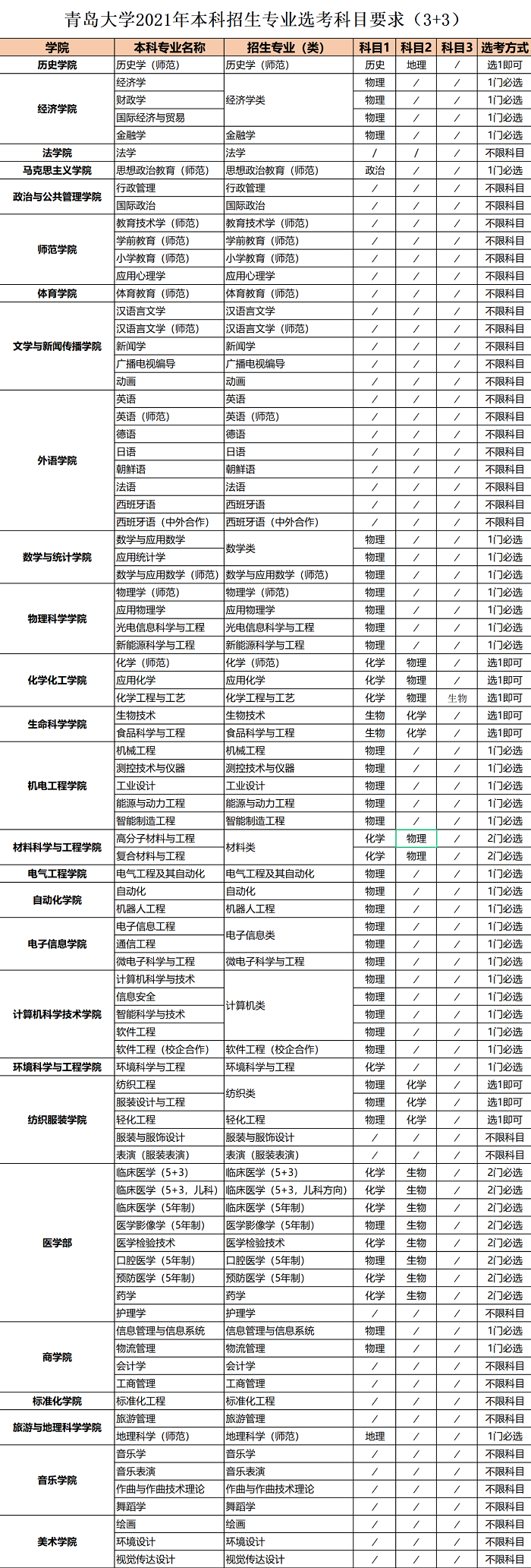 青岛大学2021年本科招生专业选考科目要求(3+3模式)