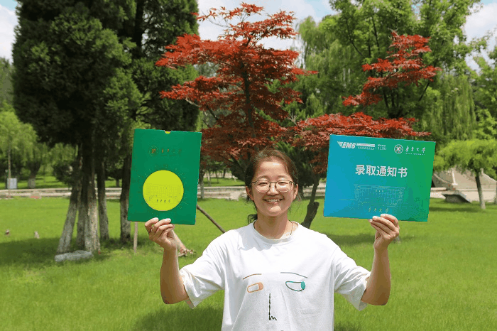 封套采用鲁东大学标准绿色,正面中空,以年轮展现鲁东大学91年光辉历程。绿色,象征生命,彰显生机,兆示未来;年轮,镌刻前行足迹,承载前进梦想,为奋斗者注入勇往直前的力量。封套背面为鲁大赋。封套和录取通知书正面均无印刷,全部采用烫金工艺,凸显鲁东大学严谨、精益、卓越的质量文化。