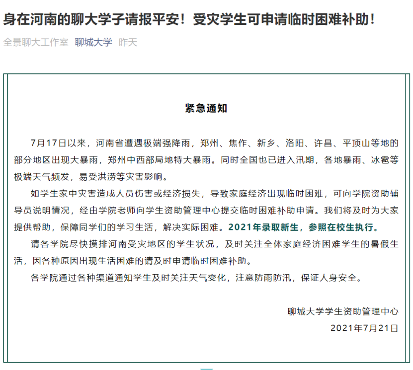 身在河南的聊大学子请报平安!受灾学生可申请临时困难补助!