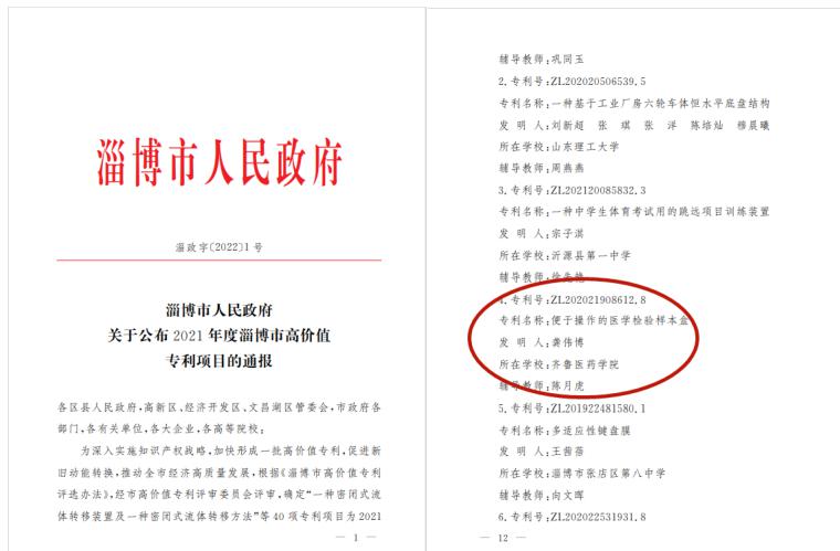 近日,从《淄博市人民政府关于公布2021年度淄博市高价值专利项目的通报》(淄政字〔2022〕1号)文件获悉,齐鲁医药学院一项实用新型专利获2021年度淄博市优秀学生发明项目,奖金一万元。