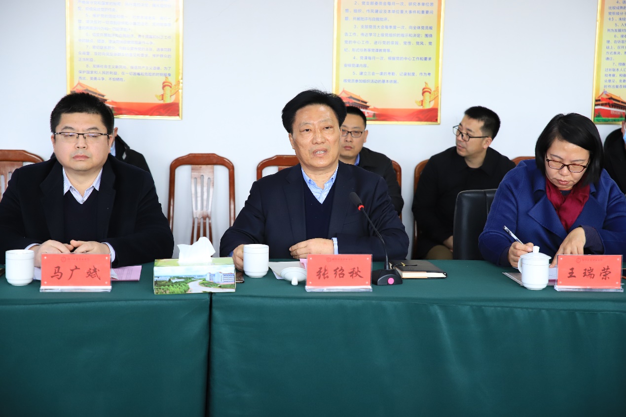 张绍秋主任向考察团一行介绍了学校基本情况,并从实体化运作职教集团,产权化建设产业学院、专业化建设产教联盟等多个方面展开情况汇报。