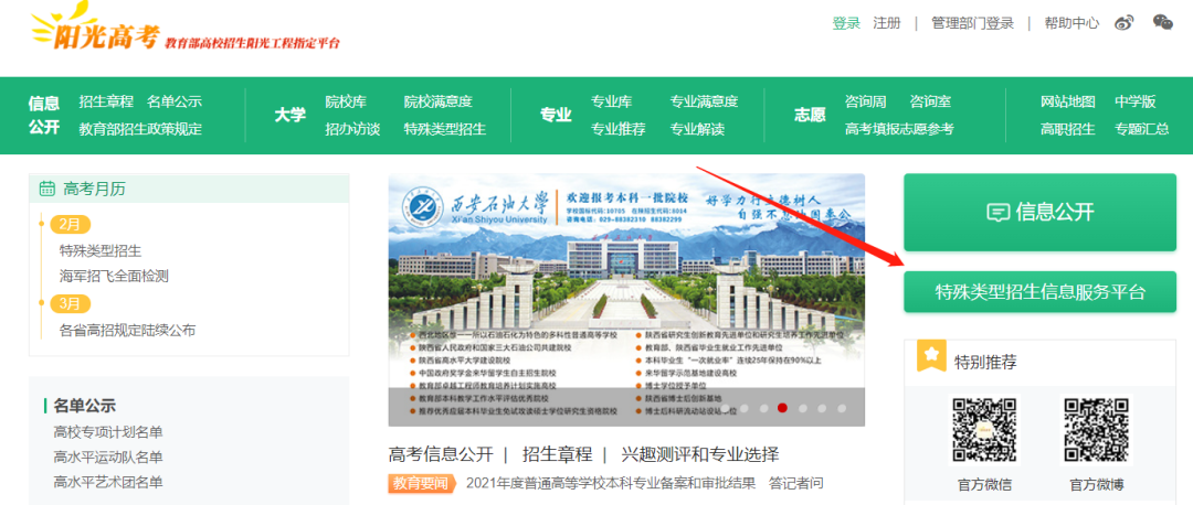 https://gaokao.chsi.com.cn/进入阳光高考官网,然后点击“特殊类型招生信息服务平台”。