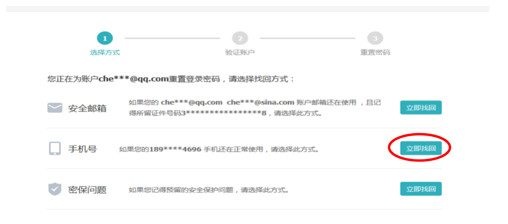 3、在安全邮箱、手机号和密保问题中选一种自己记得相关信息的方式,点击其右侧的“立即找回”,然后根据相关提示要求完成密码重置,建议将新密码与用户名记录下来,防止后期再遗忘。但是,如果您以前注册时并没有设置安全邮箱、安保问题,且注册时用的手机号码现在也不再使用,则需重新注册账号,步骤见“(四)重新注册”。