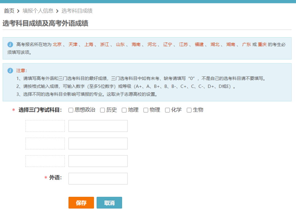 点击左侧的“成绩信息”,按照页面上的要求填写成绩信息,需注意语文和数学的分数要包含附加分在内。(注:因目前相关成绩信息并不全,但只有此项填写一些信息后才可进入下一个模块继续填写,故建议在此处先填写一部分,等一模成绩出来后,可去学校打印成绩单后再完善此处的信息)填写后,点击“下一步”。