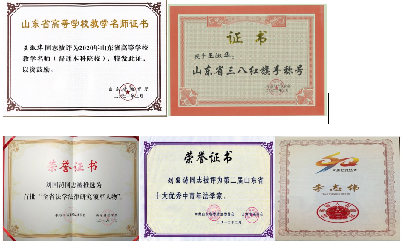 坚持“引才、育才、聚才”思路,形成“学科带头人+特色授课团队”师资团队,拥有山东省级教学名师1人,山东省三八红旗手1人,山东省优秀中青年法学家1人,“齐鲁和谐使者”称号2人,首批“全省法学法律研究领军人物”1人,山东省优秀仲裁员1人,山东省理论人才“百人工程”1人,山东社会科学院“领军人才”1人,各级政府专家委员会委员或顾问库咨询专家14人,最高人民检察院“民事行政检察专家咨询网”专家2人,山东省人民政府行政复议委员会委员1人,山东省检察院民事行政检察监督案件专家委员会委员、山东省人民政府信访事项听证员2人,国家级研究会理事3人,山东省老年学与老年医学会常务理事1人,济南市社会工作督导专家3人,山东省社会学学会常务理事1人,仲裁委仲裁员6人,校十佳教师3人,校十佳工作者1人。7人赴美国、荷兰、瑞典、英国等国际知名高校访学,2人获德国法学博士学位,1人获莫斯科大学社会学博士学位,1人获韩国新罗大学法学博士学位。