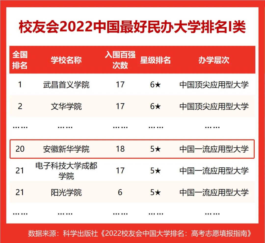 2022中国大学四大主流排行榜(软科、校友会、武书连、金平果)发布,安徽新华学院均位列安徽省民办高校榜首。
