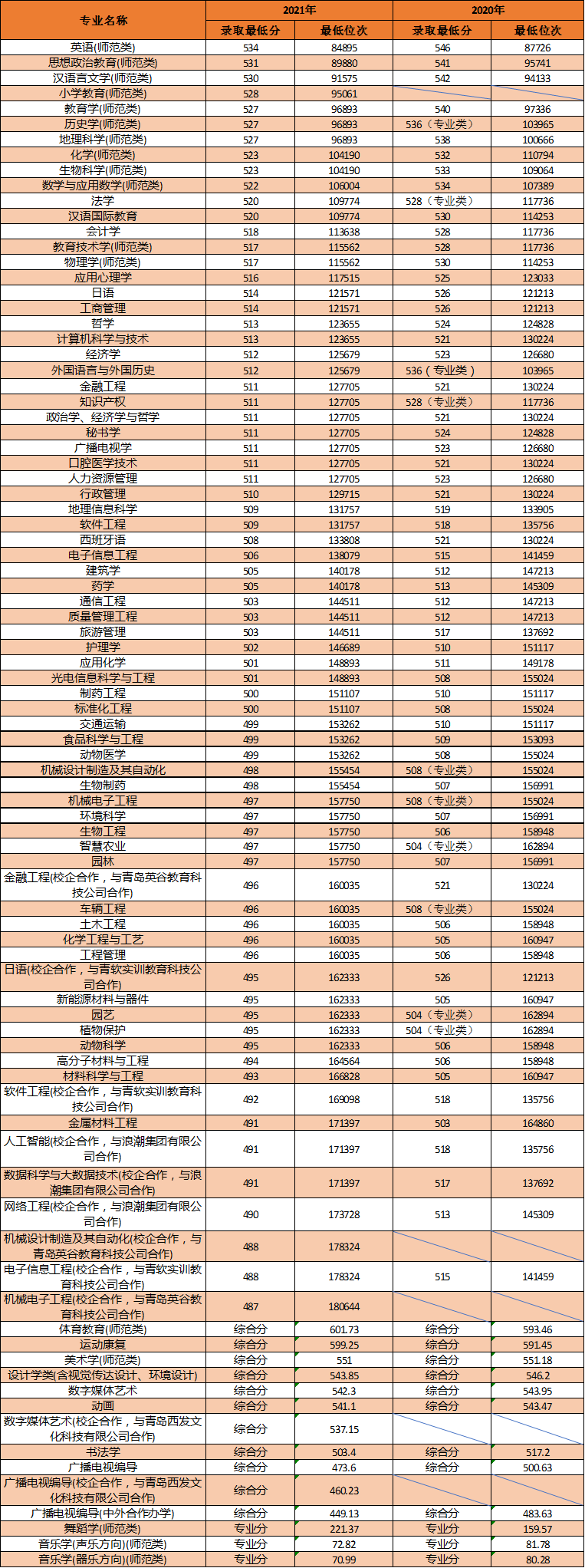 2020-2021年山东省分专业录取最低分及位次