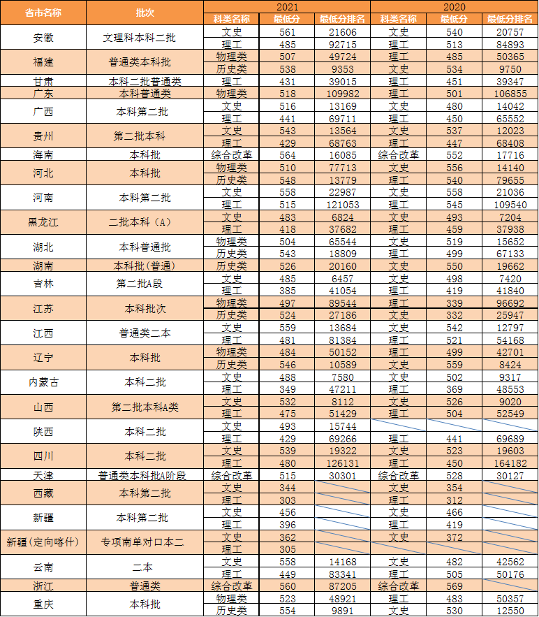 2020-2021年省外分专业录取最低分及位次