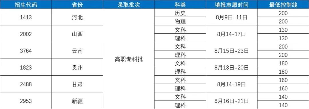 注:河北、山西、云南、贵州、甘肃、新疆的考生,建议达到各自省份的专科填报资格线上第一志愿填报我校,以提高录取率。