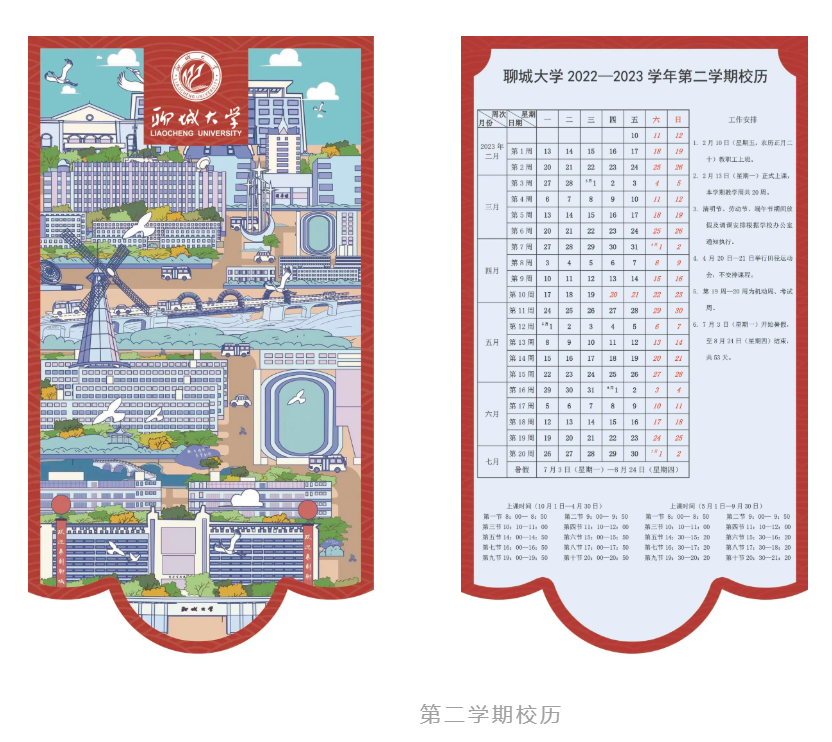 色彩以传统红色、金色为主,寓意吉祥喜庆,凸显金榜题名的喜悦之情。设计元素以聊城大学代表性人文景观为主,辅以聊大标志、校训等图标、文案,一根细线穿越时空,迎着朝阳放飞梦想,在充分体现聊大风貌、聊大精神的同时,尽显“敬业、博学、求实、创新”的聊大校训和“学在聊大,奠基人生”的美好祝愿。