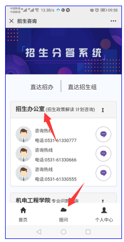 线上分答系统可在首页查看精华问题,也可以选择“直达招办”或“直达招生组”。