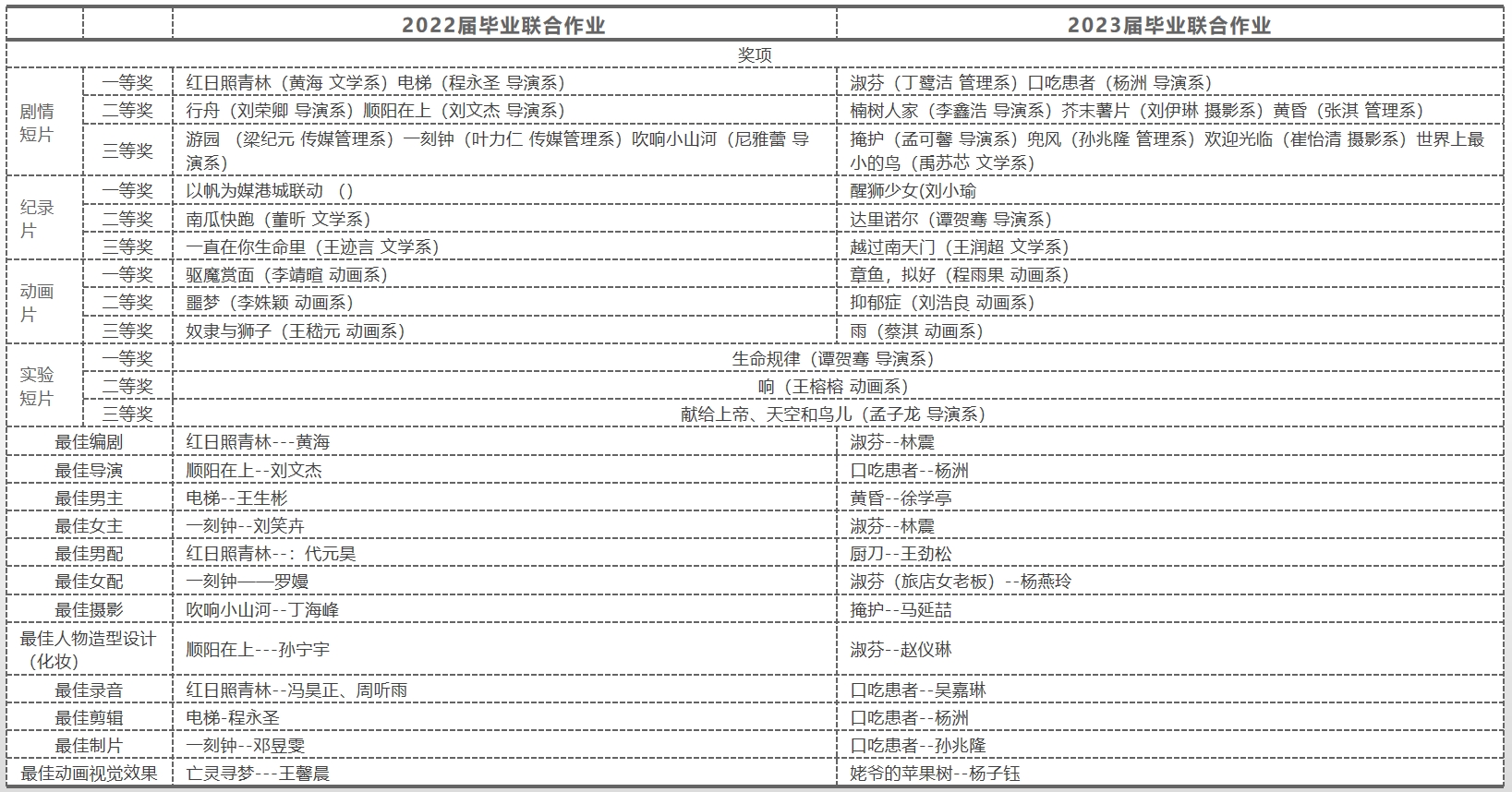 此次金象奖颁奖典礼是为2022届和2023届两届毕业联合作业共同举办的,是学校一次隆重而又特殊意义的大型活动,两届毕业联合作业共计拍摄完成影片61部。其中,故事片36部,纪录片13部,动画片12部,并已经在2023年OSFF青少年短片展、第22 届北京电影学院动画学院奖、第十一届中国大学生电视节等国内外重要赛事总斩获大奖!