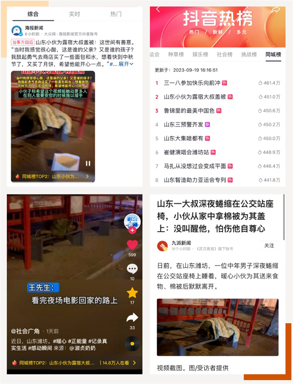 近日,我们电话联系到了这条视频的记录者,他是今年6月份刚毕业于山东工程职业技术大学智能制造学院的学生王循然。他向我们分享道:当时是在回家的路上遇到的那位大叔,只见他衣衫褴褛蜷缩在公交站牌的座位上,我心里受到了很大的触动,甚至泛红了眼眶,于是我鼓起勇气去了最近的便利店买了食物和水,想着马上要中秋了,或许这提月饼能够带给他一丝慰藉,立秋的夜晚总归是有几丝寒意,我又回家拿了一床被子为他盖上。我轻轻拍了拍他,本想递给他食物与水,但想想还是算了吧,他醒了之后我不知道该怎样面对他,才能不让他的自尊心受到伤害,我不知道他是谁的父亲,又是谁的孩子,也不知道他经历了什么,只想在此刻为饱经风霜的他带来几丝温暖。