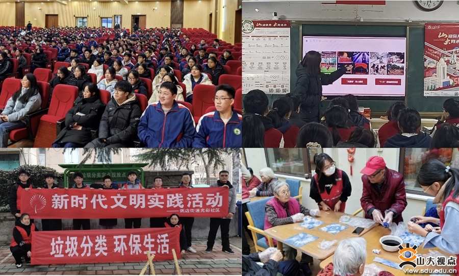 扎根基层践行使命,志愿公益温暖民心。山东大学真情帮帮队积极响应学校号召,参与社区的义务劳动活动,开展了环境整治、社区清洁和公共设施维护等工作。长者学院之情暖银丝队深入养老院,组织扎染手工活动,为老年人设计了一系列文创产品,点燃更多老年人享受文化、享受生活的热情,展现了新时代青年敬老爱老的传统美德;山东大学138宣讲队在寒假期间共走访6所高中,通过线上线下两种渠道,与高中生们互动交流,在青蓝对接中传递宝贵经验;山东大学“传山大情,集鲁之星”宣讲团在回访母校的实践中,顺利开展了共计8次宣讲会与讲座,共计千余人参会。