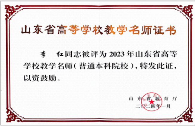 近日,山东省教育厅发布《关于公布2023年山东省高等学校教学名师名单的通知》(鲁教师函〔2024〕4 号),山东石油化工学院经济管理与文法学院李红教授获评“2023年山东省高等学校教学名师”荣誉称号。