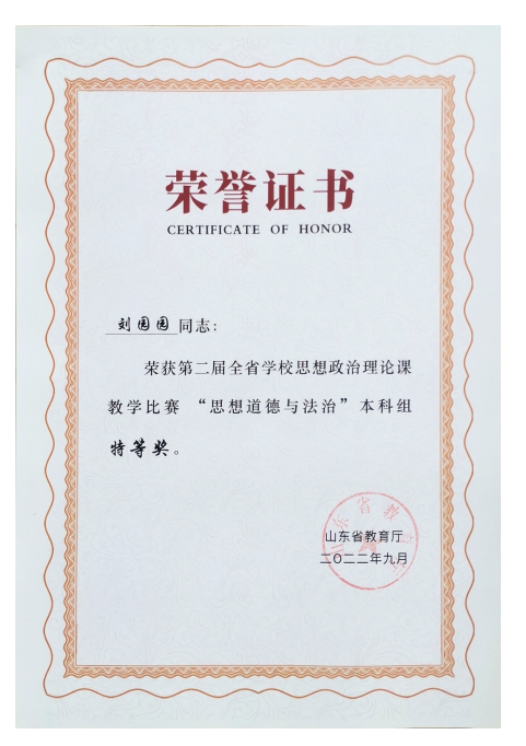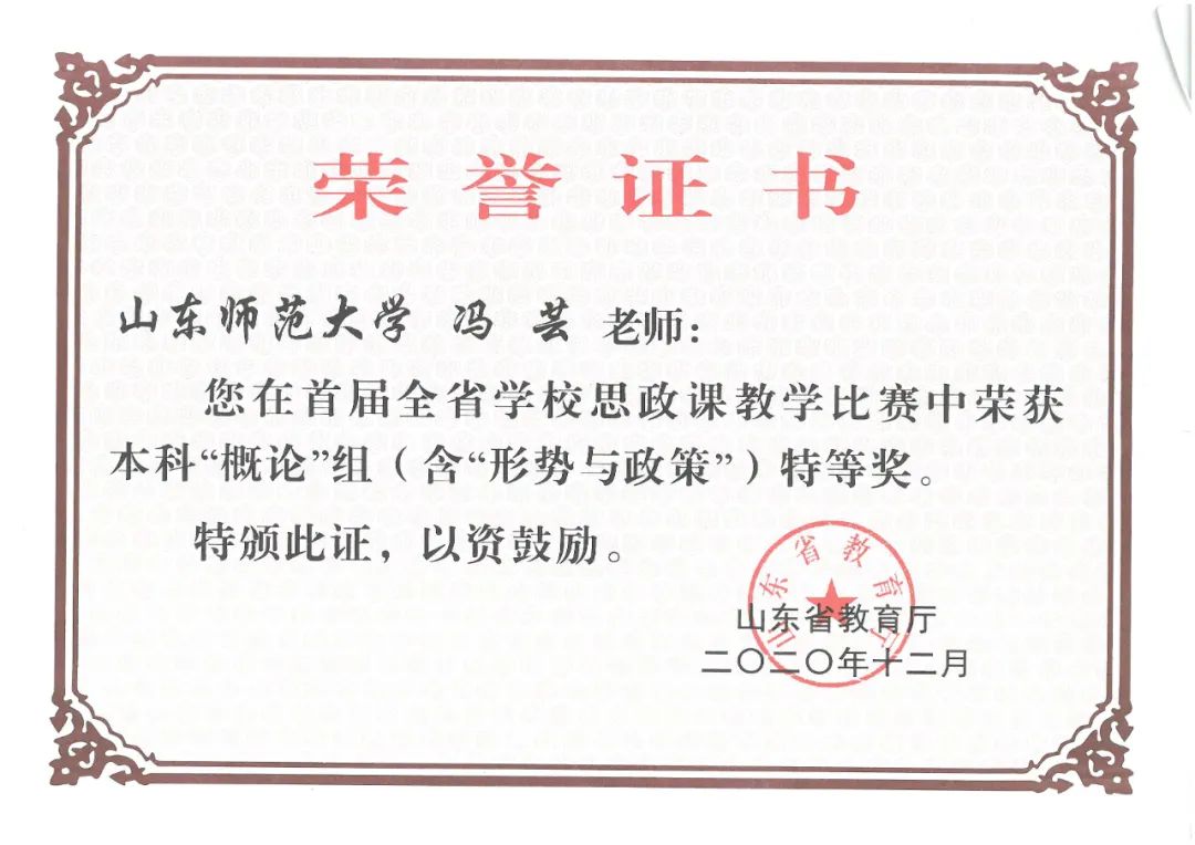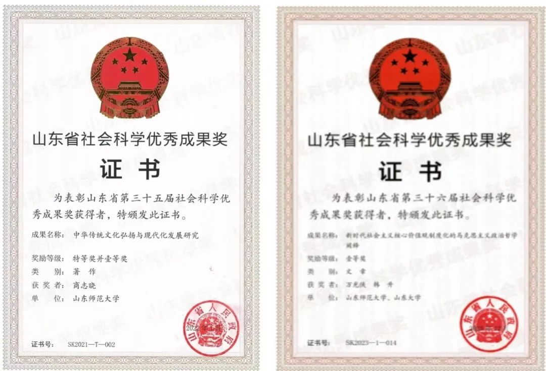 教指委委员2人、山东省泰山学者青年专家2人、山东省学校思政课教指委委员6人、山东省理论人才“百人工程”10人次;获评齐鲁文化英才、山东省教学名师、山东高校十大优秀教师、山东学校思政课教师年度人物、山东高校十佳辅导员、山东高校辅导员年度人物等15人次。
