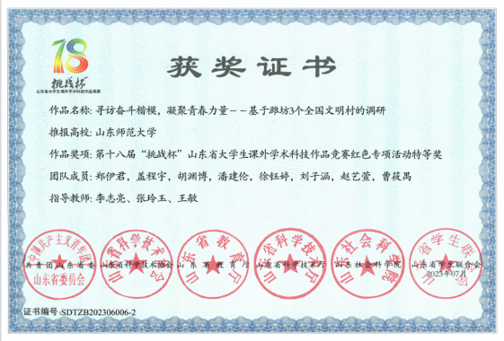 ▲学生在第十八届“挑战杯”山东省大学生课外学术科技作品红色专项中获省级特等奖