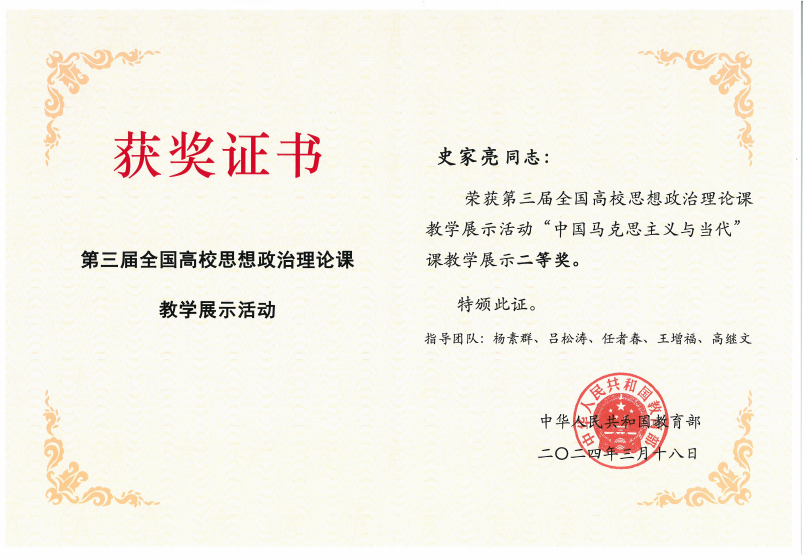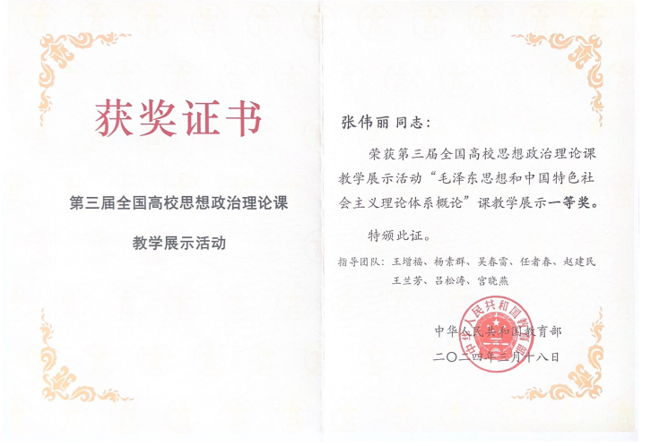 学部在全国、山东省高校思想政治理论课教学比赛,以及山东省教学成果评选中屡获佳绩。在全国高校思想政治理论课教学展示活动中,吕松涛获特等奖,宫晓燕、张伟丽获一等奖,史家亮获二等奖。在全省学校思政课教学比赛中,冯芸、刘园园获特等奖,张然、曹鹏获一等奖。在山东高校思想政治理论课教学比赛中,宫晓燕、孙强、钱晓丽、吕松涛获一等奖,曹宏获二等奖。在山东省2024年度普通高等学校教师教学创新大赛中,刘园园、王兰芳获一等奖。