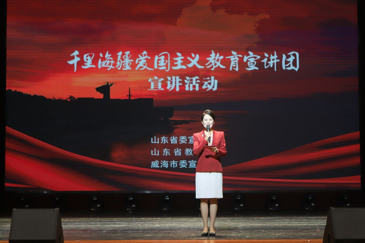 宣讲中,千里海疆爱国主义教育宣讲团成员们以情景演绎、跨时空对话等形式,通过“甲午警示钟”“他从东方来”“旗帜”“我们的奶奶从未走远”“乳娘:战火中的爱与守护”“马石山十勇士:舍生忘死恸山河”“永远的怀念”“‘威海制造’耀国威”等8个篇章,以饱满的感情带领师生重温了甲午海战、一战华工、天福山起义等历史事件,讲述了“两弹一星”元勋郭永怀、“乳娘”群体、马石山十勇士等英模事迹,讲述了在实现中华民族伟大复兴的进程中各领域各行业大力弘扬敢想敢干、敢为人先的改革创新精神,让观众深刻理解了爱国主义精神的内涵和价值。