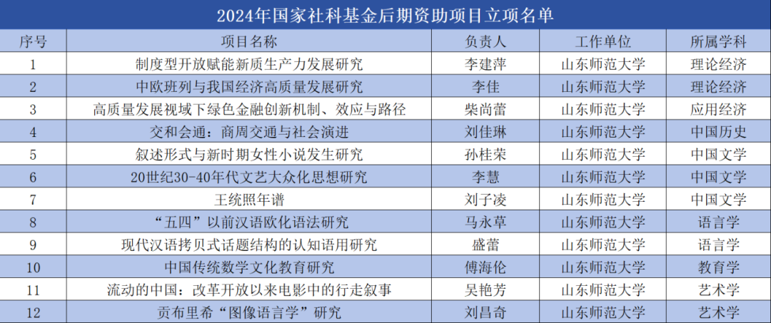近日,全国哲学社会科学工作办公室公布了2024年国家社会科学基金后期资助暨优秀博士学位论文出版、优秀学术著作再版项目立项名单,山东师范大学后期资助项目立项工作实现新突破。全校共有12个项目获批立项,较历史最好成绩增加2项,立项总数排名全国第15位,师范类高校第2位,省属高校首位。山东师范大学立项的12个项目涉及7个学科,其中,中国文学立项3项,理论经济、语言学和艺术学各2项,应用经济、中国历史和教育学各1项。项目分布在8个单位,其中文学院4项,经济学院2项,国际教育学院、美术学院、新闻与传媒学院、历史文化学院、商学院及数学与统计学院各1项。