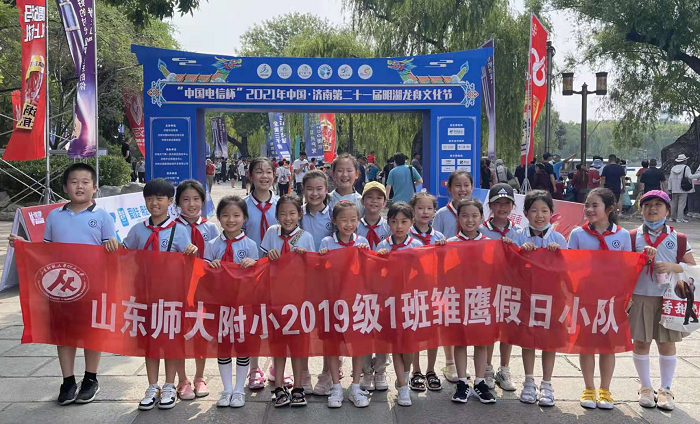 当天上午,山师附小2019级1班雏鹰小队早早来到大明湖风景区,一边认真倾听开幕式致辞,了解端午节和龙舟赛文化相关背景,一边兴奋又充满期待地守候在赛段湖畔。比赛开始之后,伴随着节奏鲜明的号子声和鼓点声,参赛龙舟各显神通、争相逐浪竞渡,大明湖上鼓声阵阵,大明湖畔同学们和其他观众一起为参赛选手呐喊助威,鼓声、号子声、呐喊声融成一片,把龙舟文化节日活动的气氛推向了高潮。