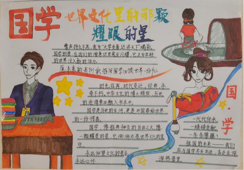 近日,济南大学城实验2022级语文组组织学生开展了以"继承传统,弘扬国学"为主题的手抄报活动,至善学子们用自己的文采和画笔勾勒出一幅幅栩栩如生的作品。
