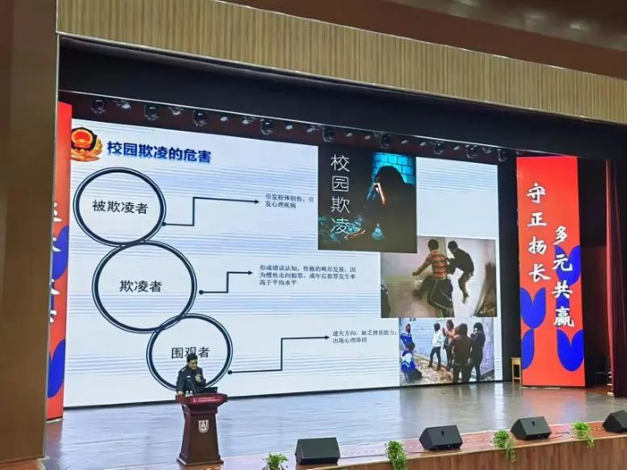 讲座伊始,毕警官以生动的案例和深入浅出的语言,向学生们阐述了校园欺凌的定义、形式和危害。他强调,校园欺凌不仅会对受害者造成身体和心理上的创伤,还会影响他们的学习和成长,甚至可能导致更严重的后果。因此,每个人都应该认识到校园欺凌的严重性,并积极参与预防和制止欺凌行为。