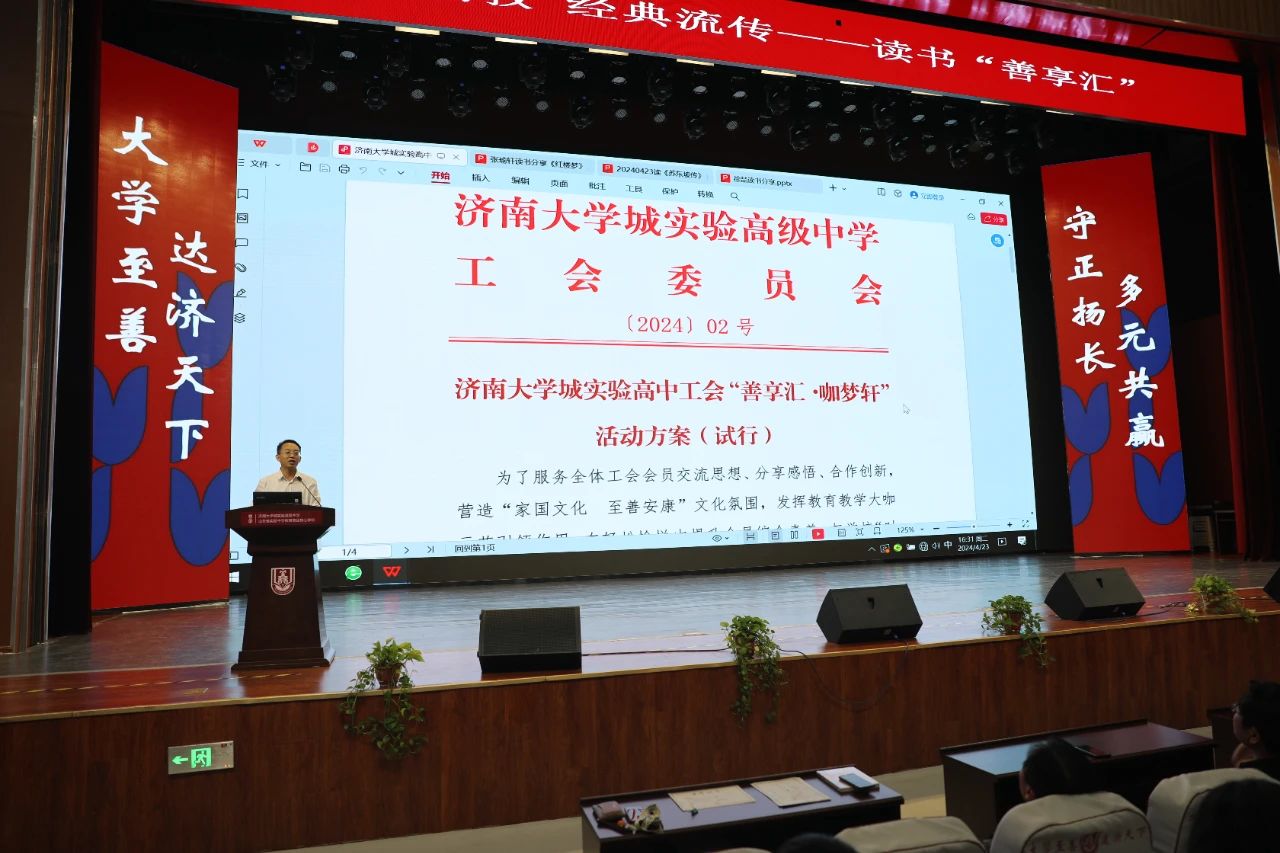启动仪式上,济南大学城实验高级中学副校长、工会主席刘威传达了活动方案。视频展示了校长郑玉香担纲主演的“善享汇·咖梦轩”公益宣传片,邀请大家一起欣赏了《读书人是幸福人》《中国话》《读宪法》三个交流短视频,与会人员给予一致赞叹。