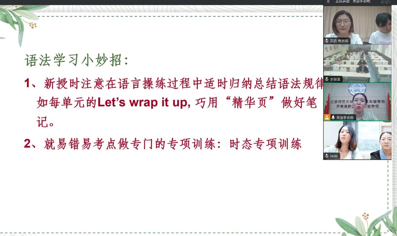 活动中,伯乐实验学校的李琎老师从复习指导思想、科学制定复习计划、各阶段复习实施三方面总结了毕业复习的重点及策略。在交流过程中,李老师细致分析了自身总结的经验,并以新课标为指导提出了按主题复习、专项复习、整理精华页、默写单词、养成圈画关键词习惯等复习策略及小妙招。与会的老师表示收获颇丰。